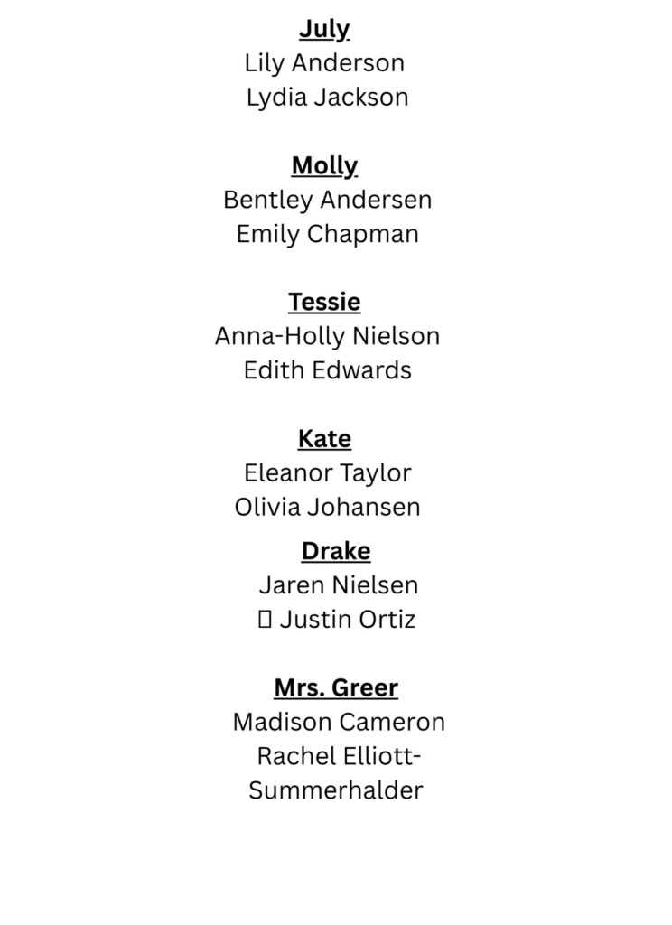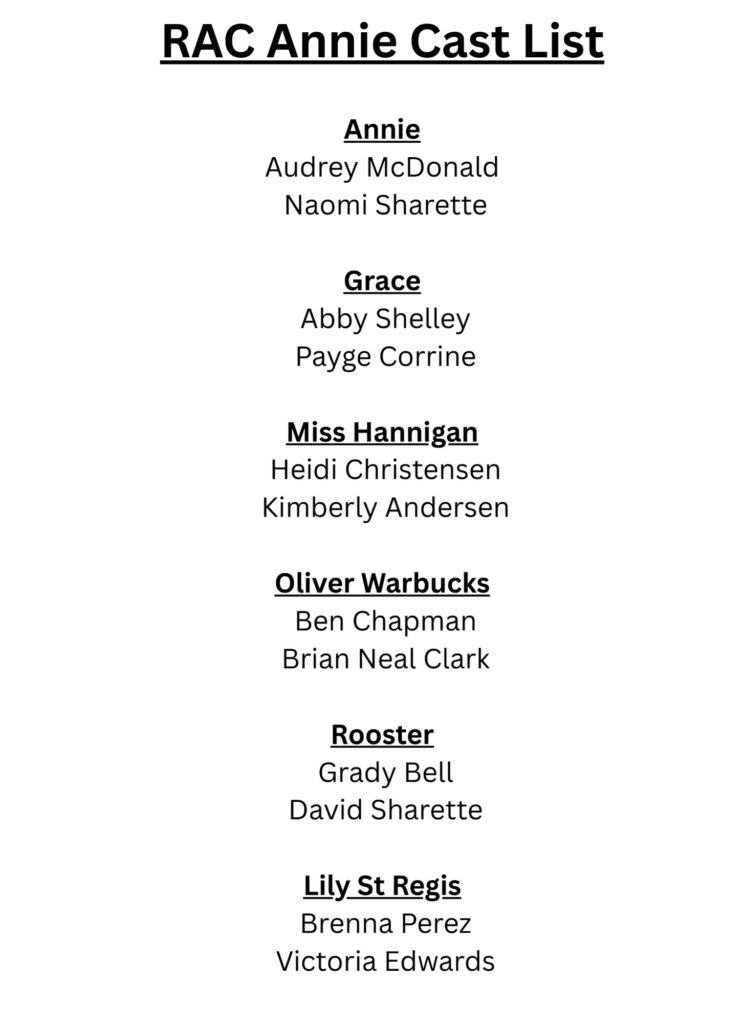 Emails have gone out to everyone who was cast. There were some people who just had too many conflicts, so unfortunately, we had to make the tough decision to not cast them at this time. In addition, there were a few people who we didn’t check in for callbacks, so it is possible that some people were left off this list unintentionally. If you believe this applies to you or your child, please reach out to annie@rivertonartscouncil.org and let us know.