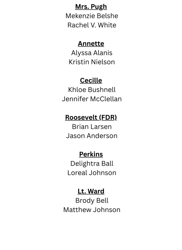 There are a LOT of smaller roles not on this list that have yet to be filled. We’ll be filling them during the rehearsal process as we get a better feel for people’s talents.