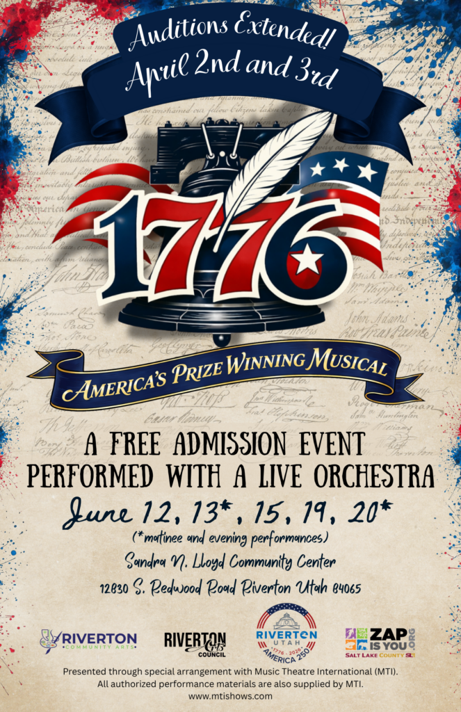 Please know that our amazing production team is making a serious effort to be efficient and respectful of cast member’s time. The ensemble and smaller roles will primarily rehearse on Saturdays and occasional Tue-Thur evenings during April and the first part of May. There is no participation fee for this project as it is part of Riverton City’s celebration of the 250th anniversary of the signing of the declaration. This is such a fun show and is going to be an awesome experience and a wonderful production!